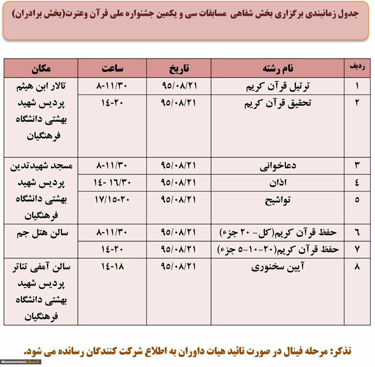جدول زمان بندی بخش شفاهی سی ویکمین جشنواره ملی قران وعترت