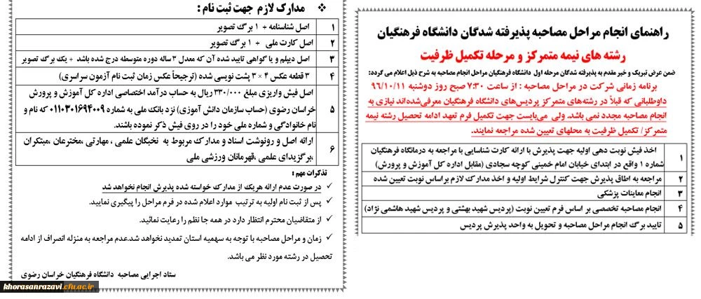 امتیاز دهید : اعلام زمان و مراحل انجام مصاحبه پذیرفته شدگان دانشگاه فرهنگیان یکشنبه 10 دی 1396 ساعت 9:42