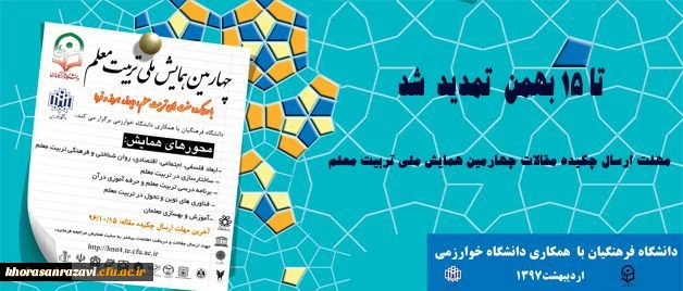 امتیاز دهید : مهلت ارسال چکیده مقالات چهارمین همایش ملی تربیت معلم تا 15 بهمن تمدید شد چهارشنبه 27 دی 1396 ساعت 16:45