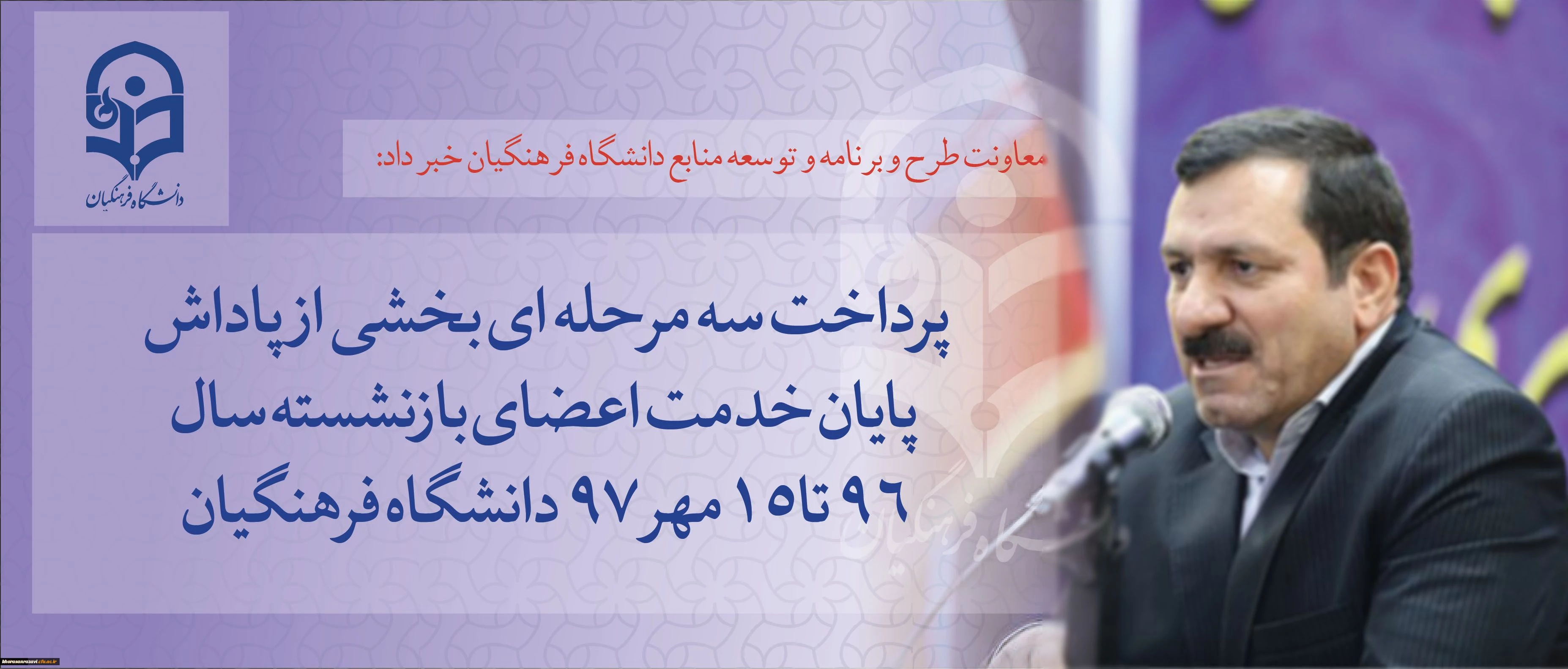 معاونت طرح و برنامه و توسعه منابع دانشگاه فرهنگیان خبر داد: پرداخت سه مرحله ای بخشی از پاداش پایان خدمت اعضای بازنشسته سال 96 تا 15مهر 97 دانشگاه فرهنگیان