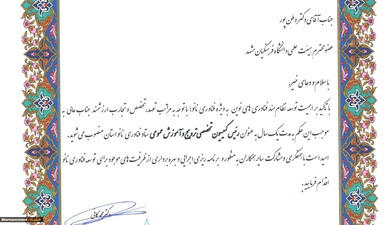 رییس کمیسیون تخصصی ترویج و آموزش عمومی ستاد فناوری نانو استان خراسان رضوی منصوب شد.