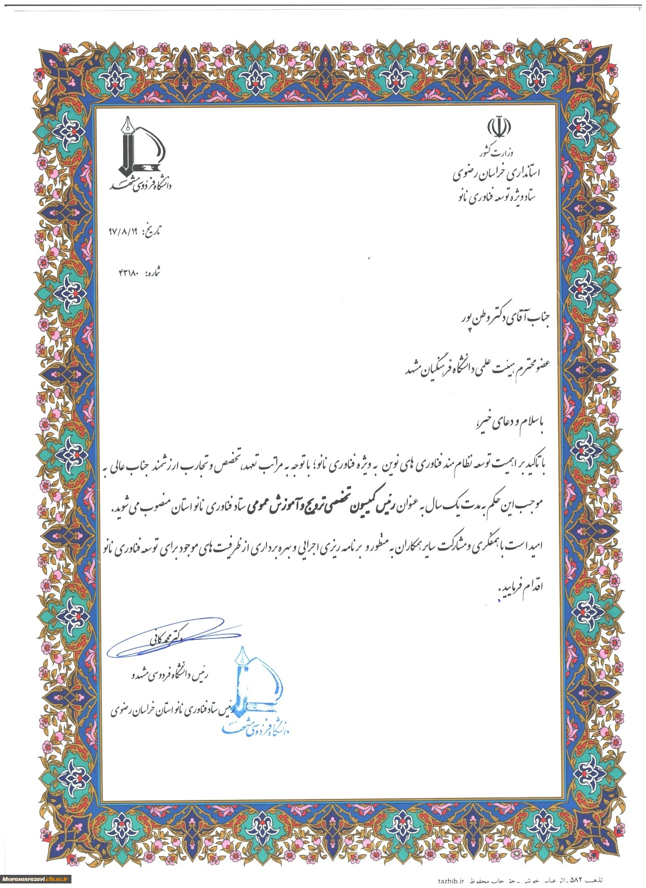 استادیار دانشگاه فرهنگیان خراسان رضوی به عنوان رییس کمیسیون تخصصی ترویج و آموزش عمومی ستاد فناوری نانو استان خراسان رضوی منصوب شد 2