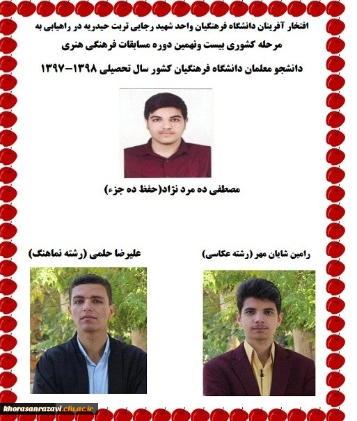 راهیابی دانشجویان دانشگاه فرهنگیان واحد شهید رجایی تربت حیدریه به مرحله کشوری بیست و نهمین دوره مسابقات فرهنگی هنری دانشجو معلمان کشور