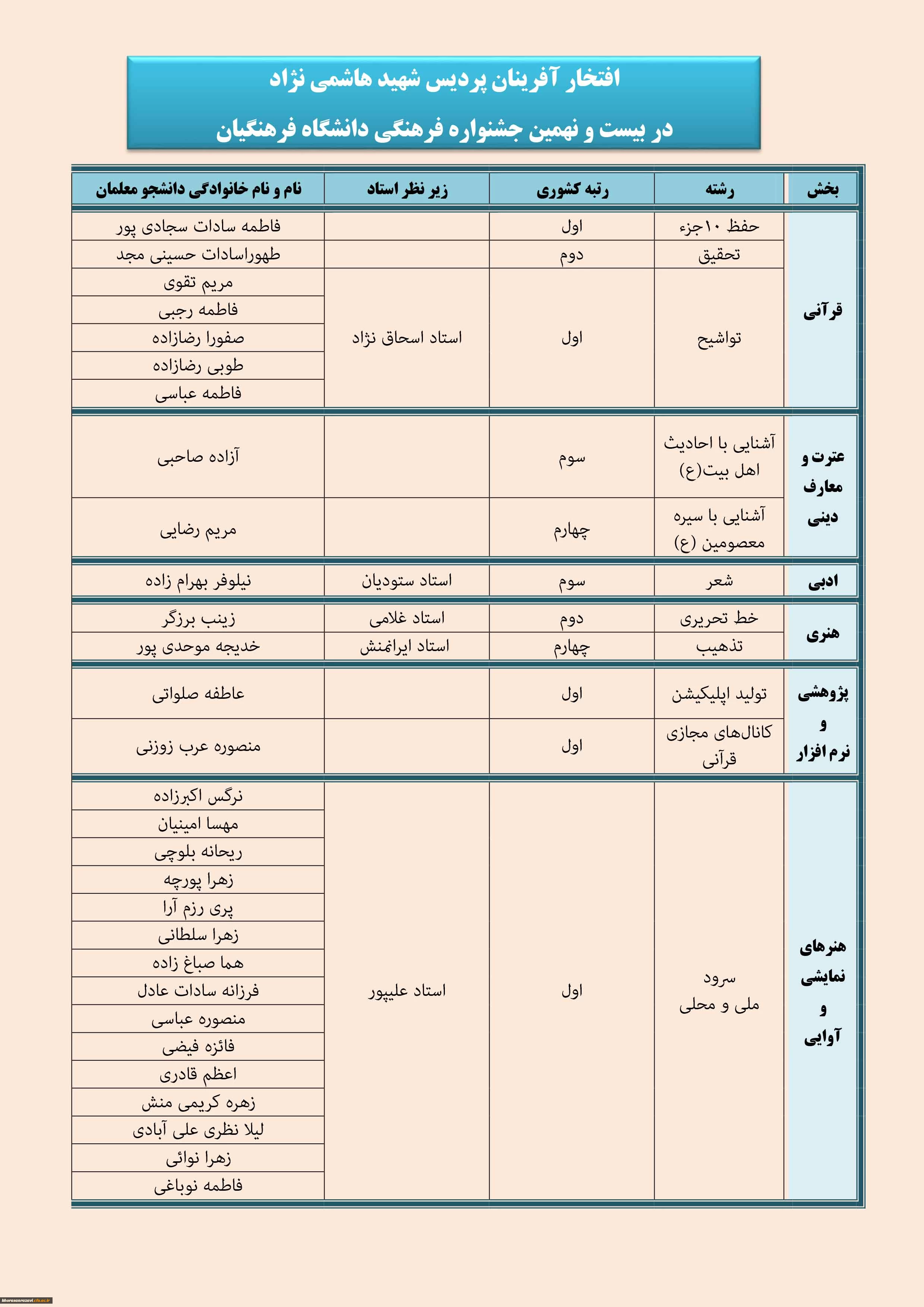 درخشش دانشجو معلمان دختر دانشگاه فرهنگیان خراسان رضوی در بیست و نهمین جشنواره فرهنگی و اجتماعی دانشجو معلمان دانشگاه فرهنگیان کشور