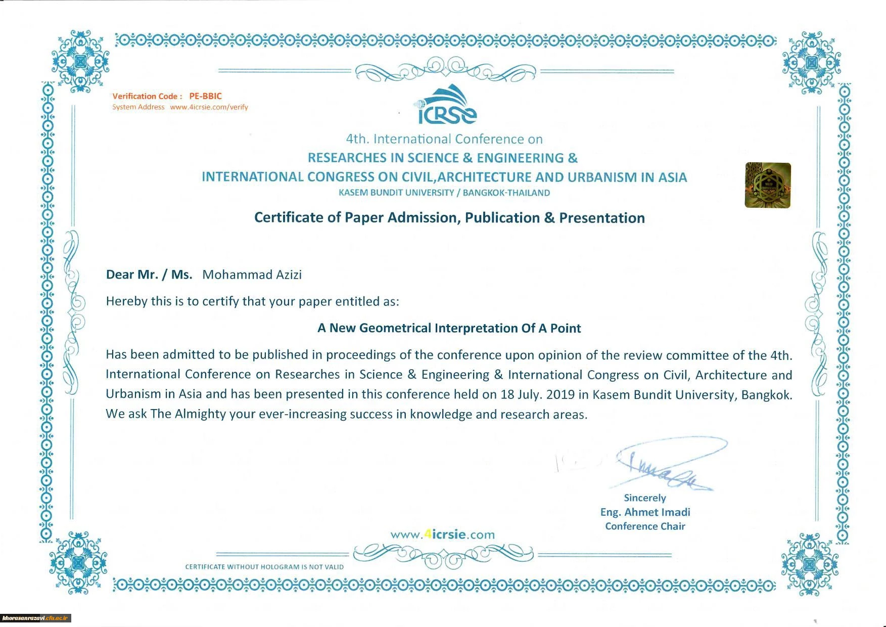 ارائه مقاله دانشجوی پردیس شهید بهشتی خراسان رضوی در کنفرانس ریاضی بانکوک 2