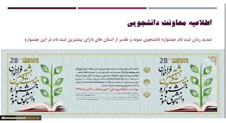 امتیاز دهید : زمان ثبت نام بیست و هشتمین جشنواره دانشجوی نمونه تا 20 آبان تمدید شد. شنبه 18 آبان 1398 ساعت 9:11