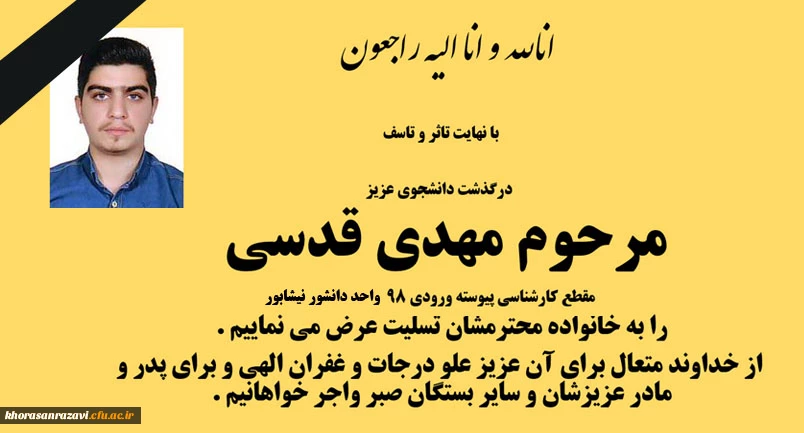 امتیاز دهید : تسلیت به مناسبت درگذشت دانشجوی گرامی زنده یاد مهدی قدسی 2 سهشنبه 19 مرداد 1400 ساعت 10:59