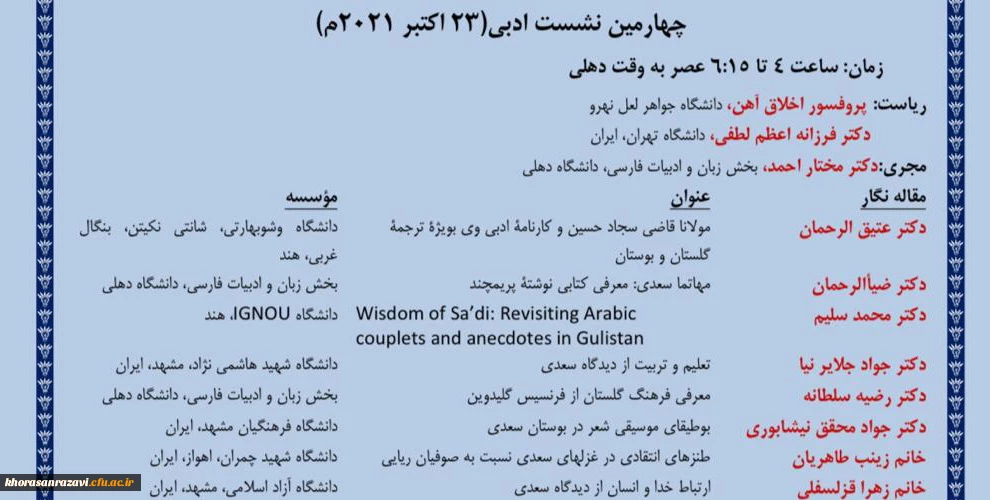 ارائه مقاله پژوهشی عضو هیات علمی دانشگاه فرهنگیان خراسان رضوی در همایش بین المللی بخش زبان و ادبیات فارسی دانشگاه دهلی