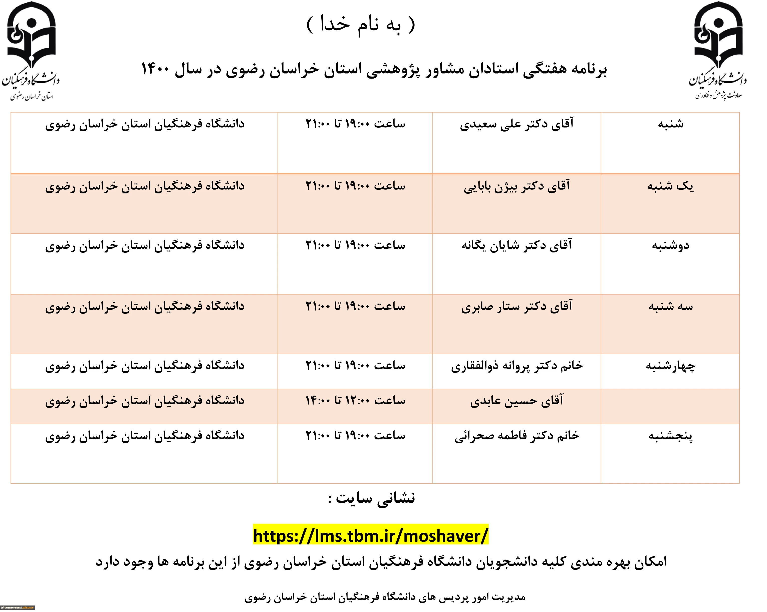 امتیاز دهید : اعلام برنامه هفتگی استادان مشاور پژوهشی استان خراسان رضوی 3 سهشنبه 11 آبان 1400 ساعت 7:52