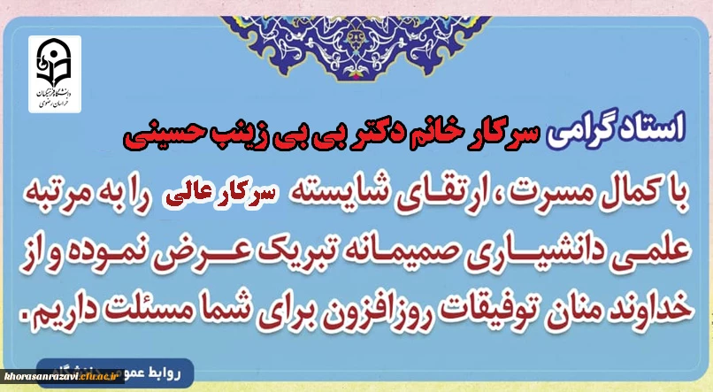 عرض تبریک به سرکار خانم دکتر بی بی زینب حسینی جهت ارتقاء از مرتبه استادیاری به دانشیاری
