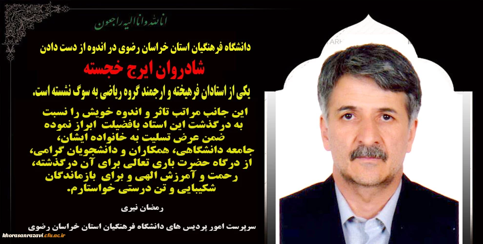 امتیاز دهید : پیام تسلیت به مناسبت درگذشت استاد فرهیخته شادروان ایرج خجسته دوشنبه 4 بهمن 1400 ساعت 12:05