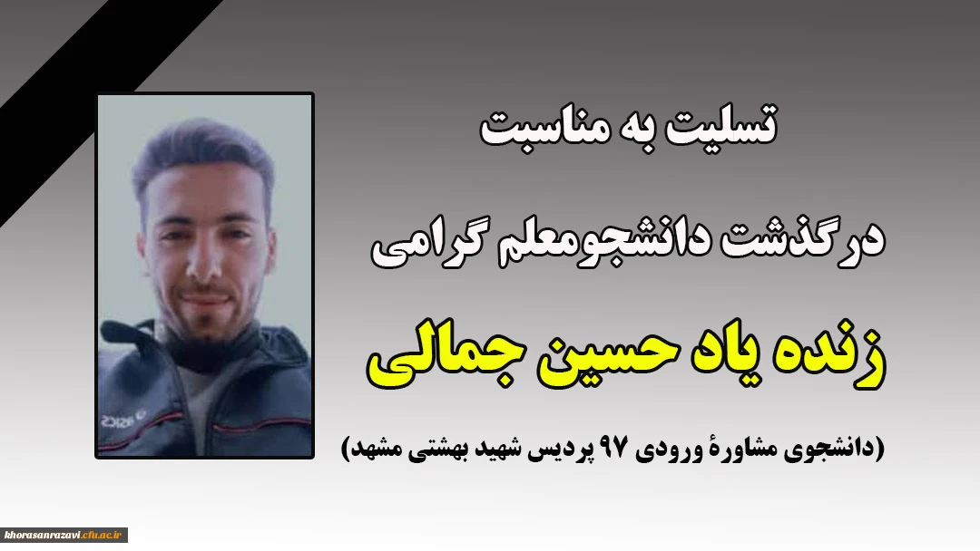 امتیاز دهید : تسلیت به مناسبت درگذشت دانشجومعلم گرامی زنده یاد حسین جمالی شنبه 20 فروردین 1401 ساعت 17:22