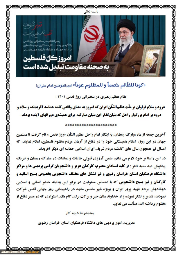 پیام مدیر امور پردیس های دانشگاه فرهنگیان خراسان رضوی به مناسبت راهپیمایی پرشکوه روز جهانی قدس