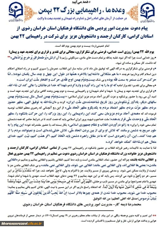 دعوت از استادان گرامی، کارکنان ارجمند و دانشجویان عزیز برای شرکت در راهپیمایی 22 بهمن 2