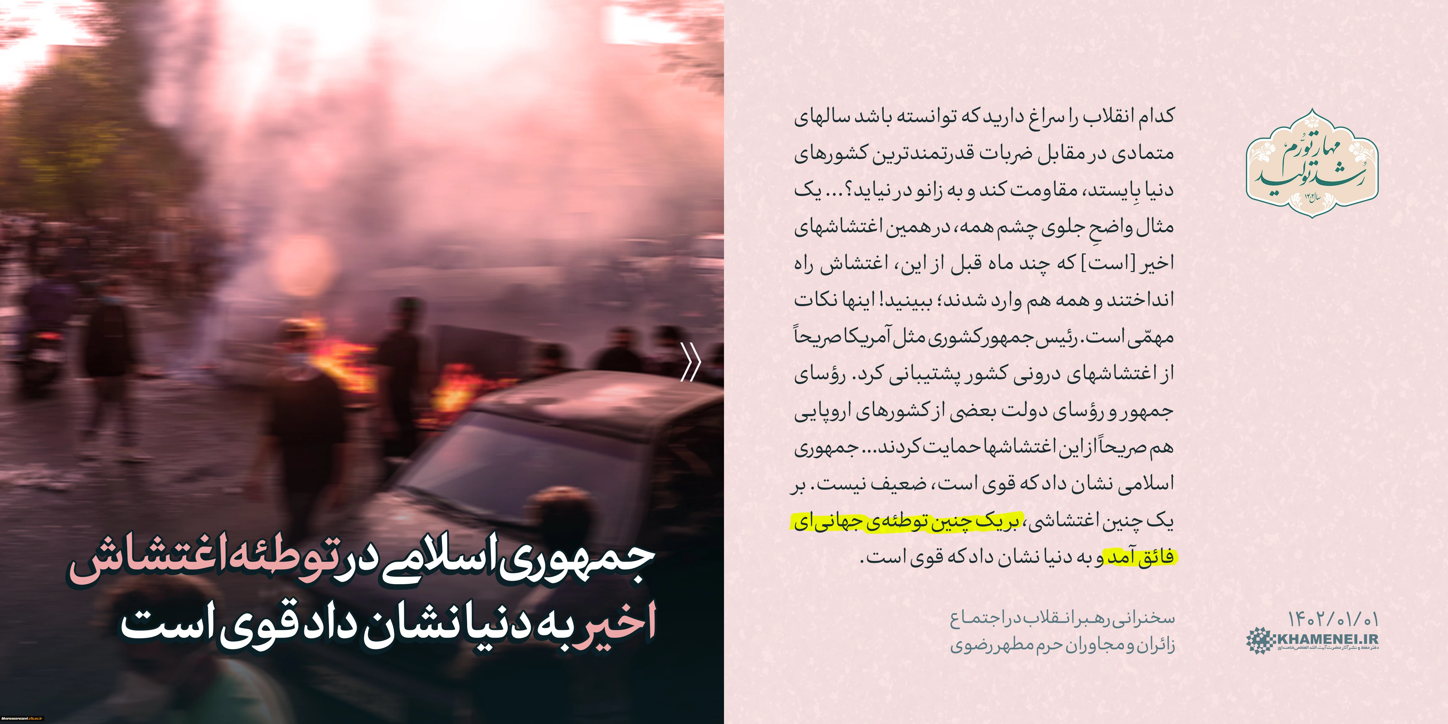 امتیاز دهید : گزیده4بیانات رهبر معظم انقلاب در اجتماع مردم مشهد - نوروز 1402 چهارشنبه 9 فروردین 1402 ساعت 21:40