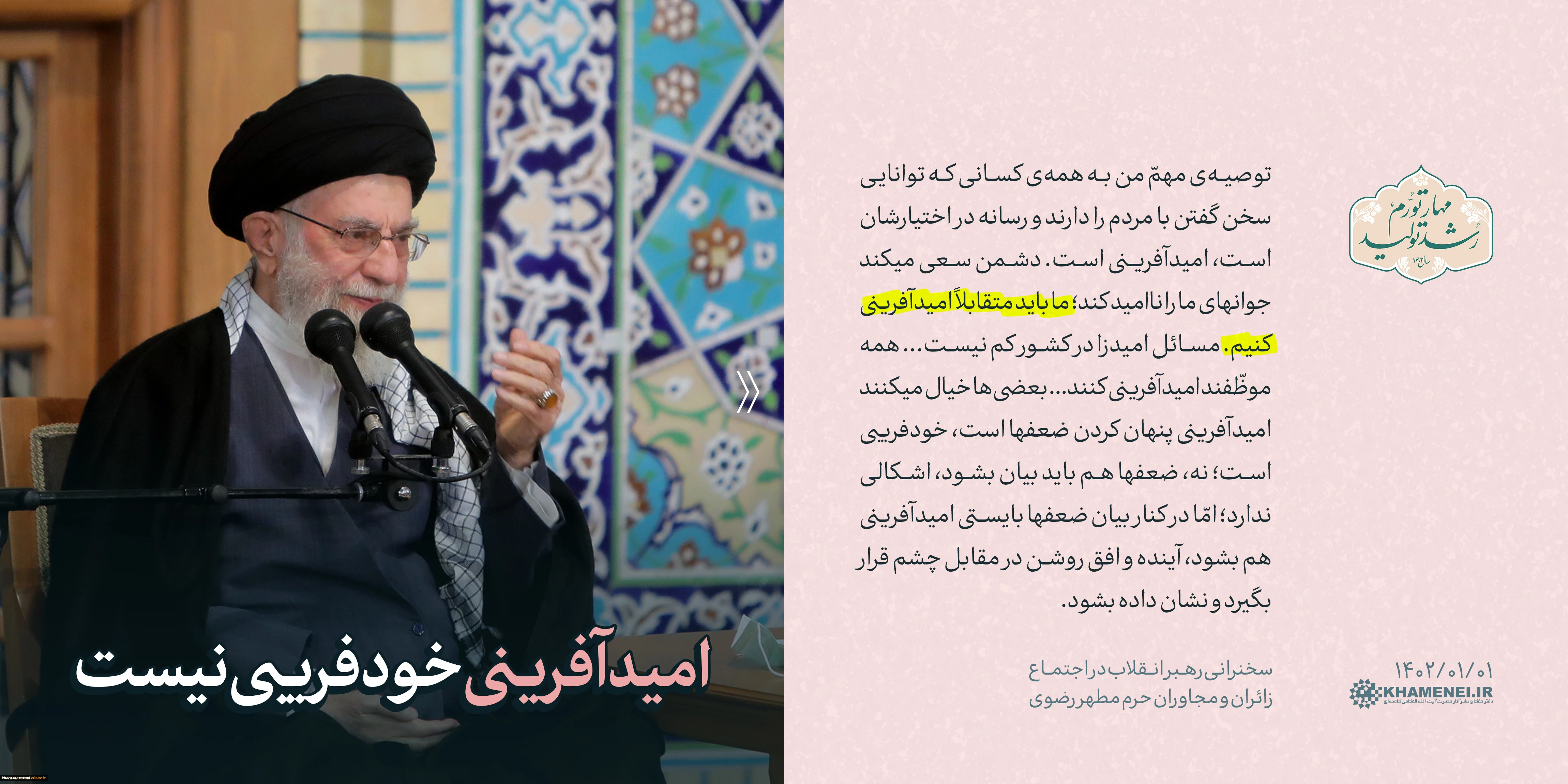 امتیاز دهید : گزیده5بیانات رهبر معظم انقلاب در اجتماع مردم مشهد - نوروز 1402 چهارشنبه 9 فروردین 1402 ساعت 21:40