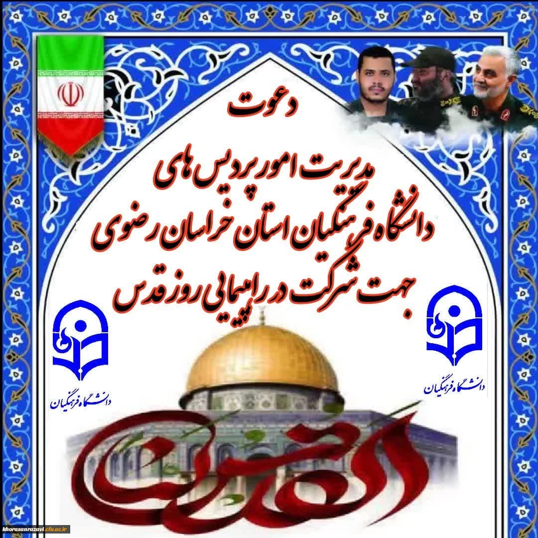 پیام مدیریت امور پردیس های استان خراسان رضوی جهت دعوت به شرکت در راهپیمایی روز قدس 3