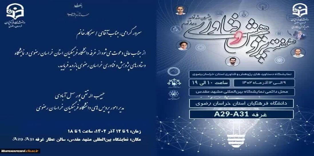 امتیاز دهید : نمایشگاه دستاوردهای پژوهش و فناوری دانشگاه فرهنگیان خراسان رضوی 2 جمعه 10 آذر 1402 ساعت 18:35
