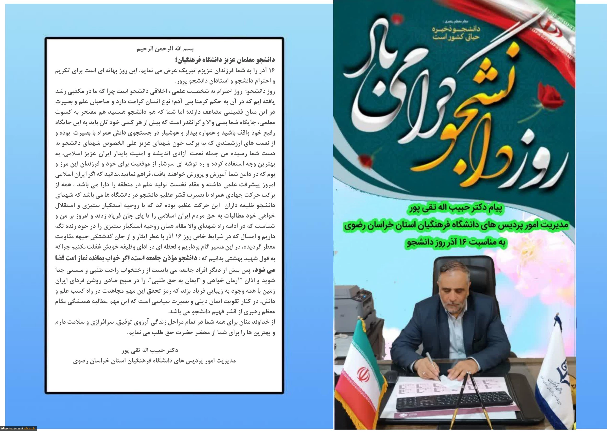 پیام دکتر حبیب اله تقی پور؛مدیریت امور پردیس های دانشگاه فرهنگیان استان خراسان رضوی به مناسبت 16 آذر ؛ روز دانشجو 2