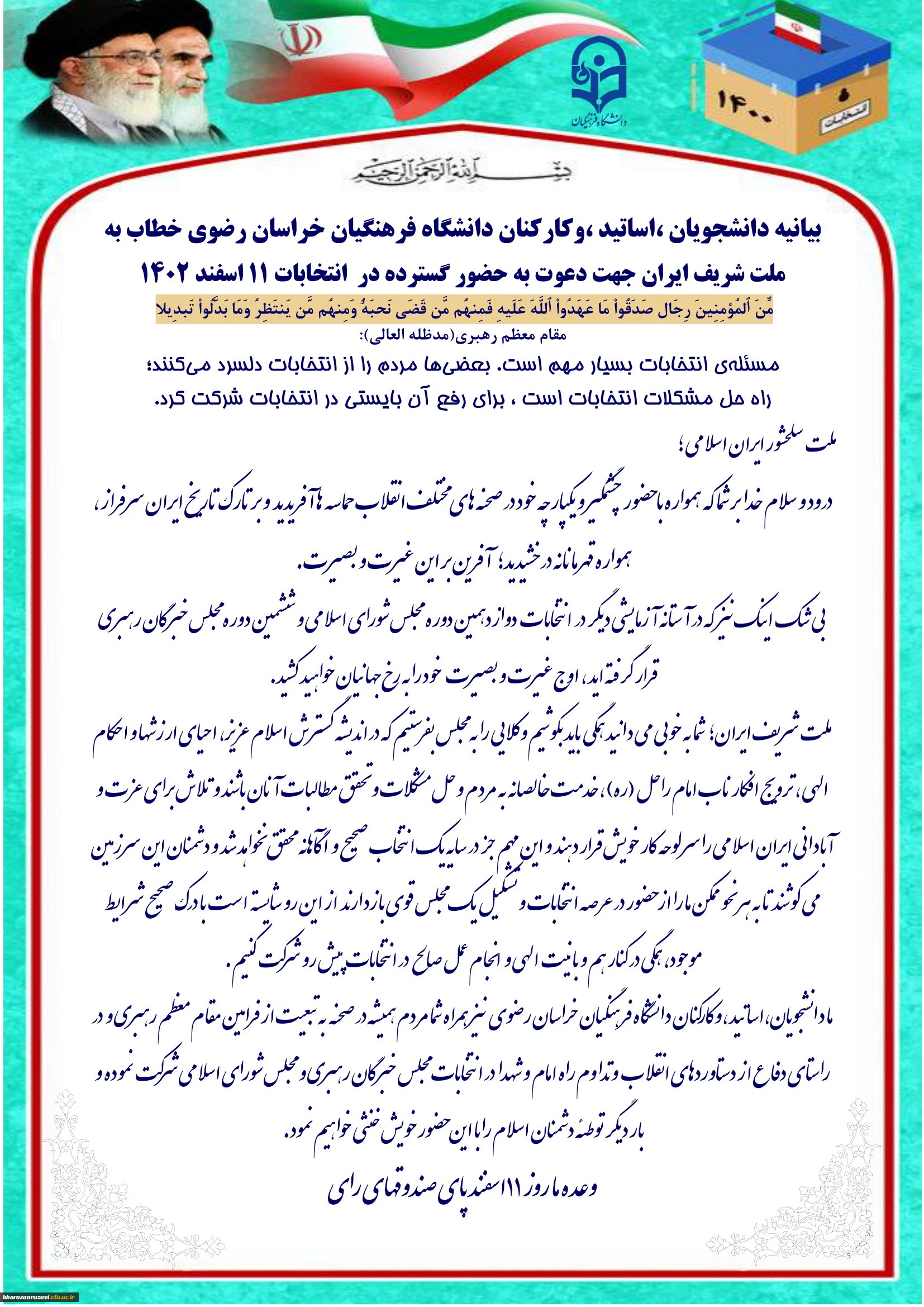 بیانیه دانشجویان ،اساتید ،وکارکنان دانشگاه فرهنگیان خراسان رضوی خطاب به ملت شریف ایران جهت دعوت به حضور گسترده در انتخابات ۱۱ اسفند ۱۴۰۲ 3