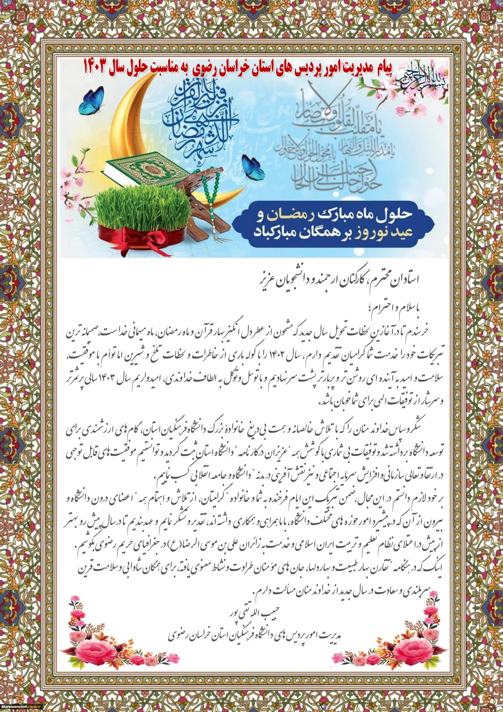 امتیاز دهید : پیام نورورزی مدیریت امور پردیس های استان خراسان رضوی 3 سهشنبه 29 اسفند 1402 ساعت 12:03