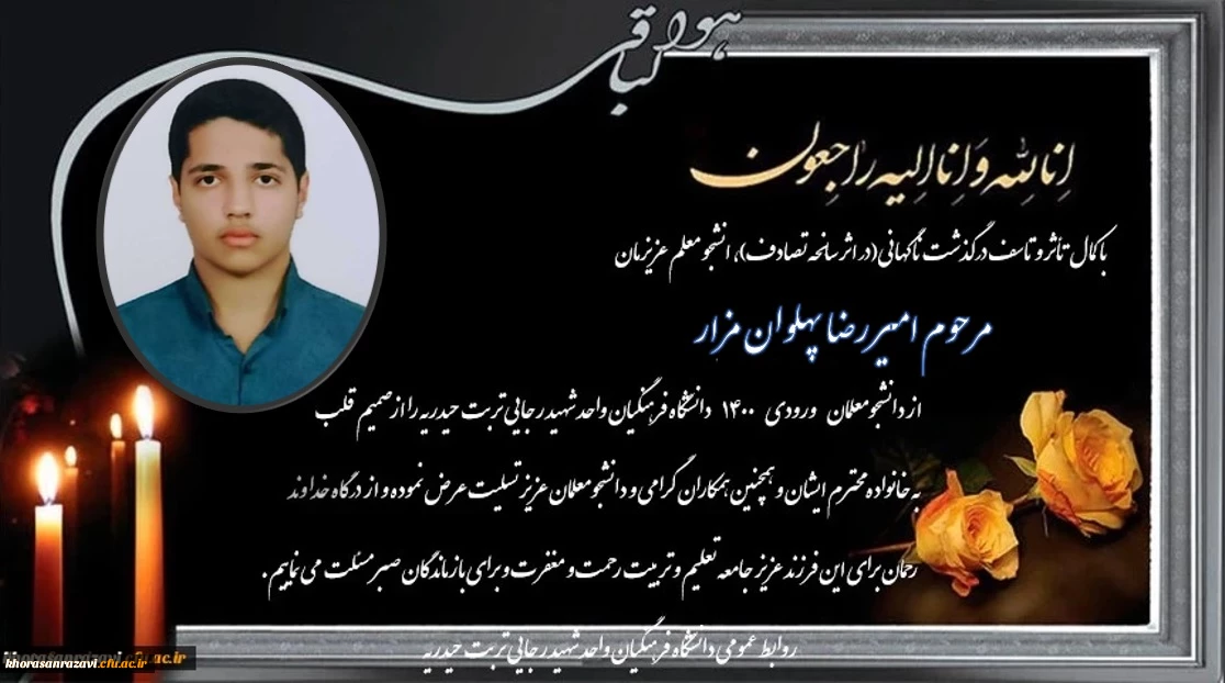 ابراز همدردی و تسلیت مجموعه دانشگاه فرهنگیان واحد شهید رجایی تربت حیدریه در پی درگذشت ناگهانی دانشجو معلم عزیزمان جناب آقای امیر رضا پهلوان مزار  2