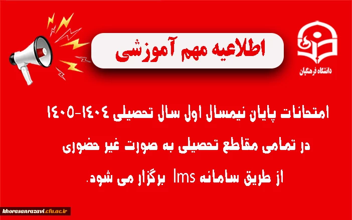 امتیاز دهید : اطلاعیه شماره ۳ | نحوه برگزاری امتحانات پایان نیمسال اول ۱۴٠۵-۱۴٠۴ 2 سهشنبه 30 دی 1404 ساعت 19:01